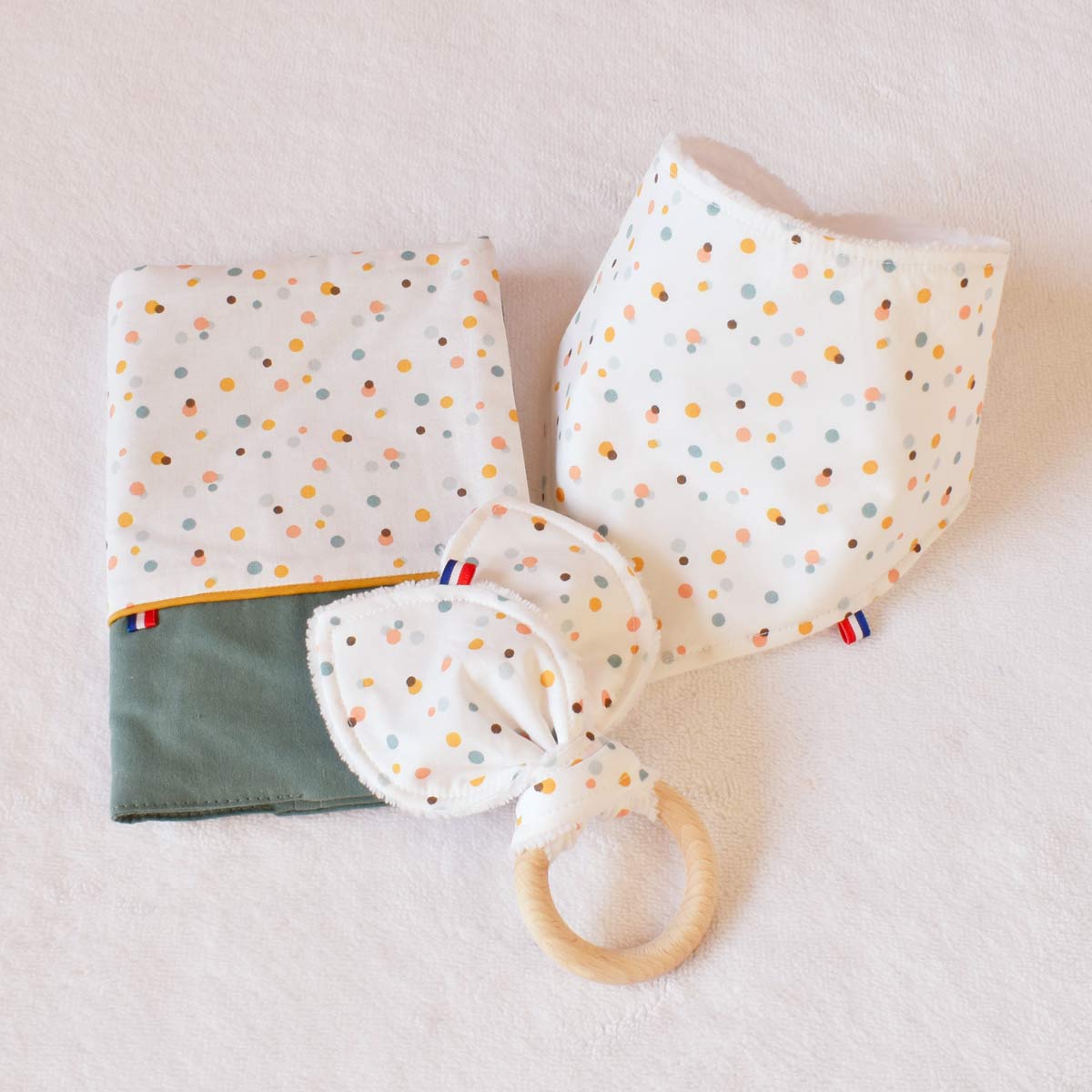 Un coffret de naissance pour bébé fait main bien utile et qui fera toujours plaisir : Un bavoir-bandana, un hochet lapin, un doudou plat et souple