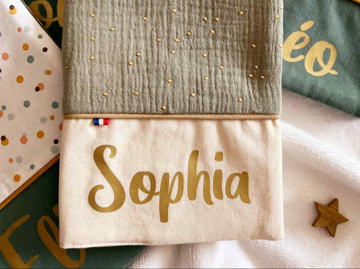 Prénom long, prénom composé ou même prénom et nom de famille, tout est faisable ! Je réalise la personnalisation avec du thermocollant, ce qui me permet d’ajuster la taille de la police. Il faut juste garder en tête que plus le prénom sera long plus la taille des lettres diminuera.